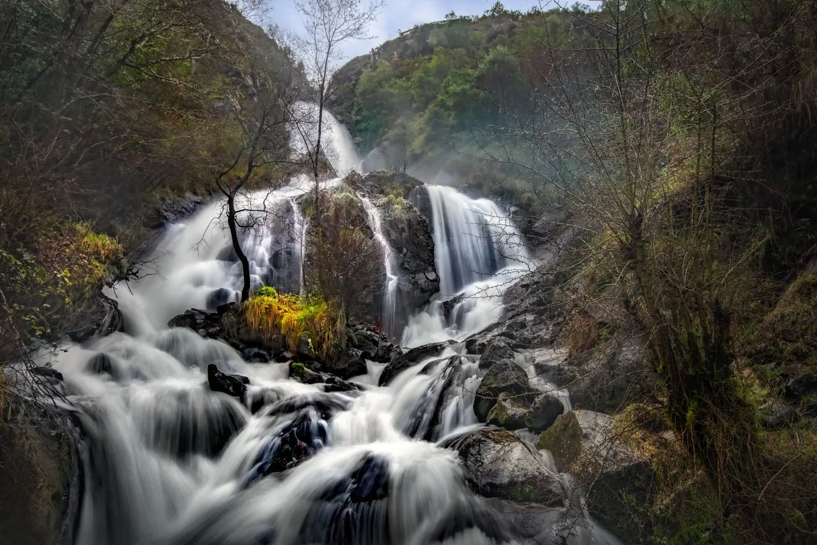 A partir de aquí, si el río lleva un caudal abundante, comenzamos a escuchar de fondo el ruido del agua de A Férveda, que va en aumento según nos vamos acercando a la cascada, pero aun no la alcanzamos con la vista hasta llegar a pocos metros de ella. Parece que desea transmitir primero su presencia sonora que visual, con la intencionalidad de sorprender y causar un mayor impacto al intruso que se aproxima a su espacio vital.