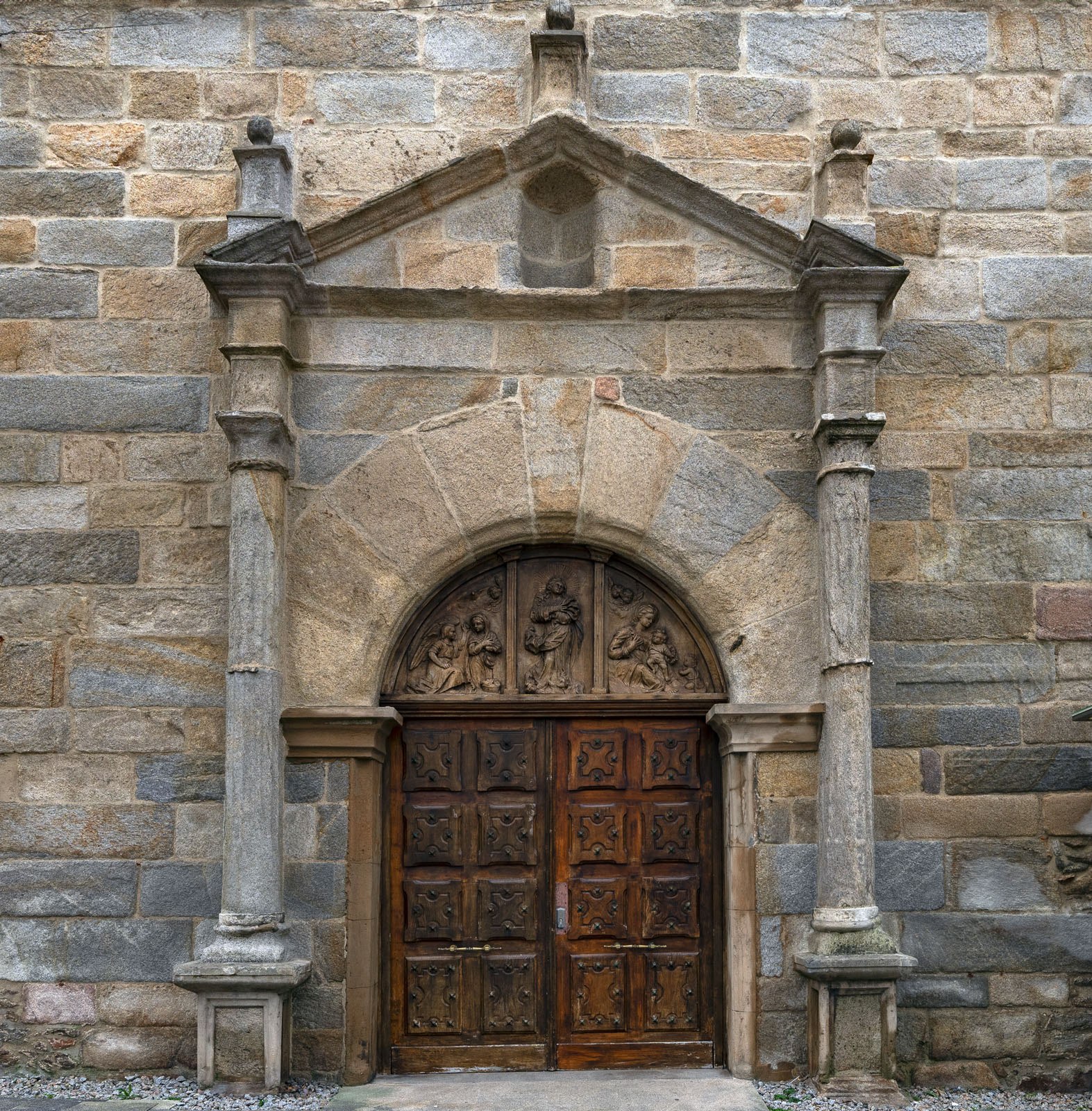 A particularly distinctive detail is the main door tympanum, featuring a wooden relief depicting the Annunciation, the Immaculate Conception, and the Virgin and Child. Outside, the silhouette is completed by a square-section bell tower and a bell gable (espadana). The church once belonged to the Convent of Saint Augustine (founded in the 16th century); attached to the western wall is a former convent building, restored in 2006 and now used as a Community Centre and Tourist Office.