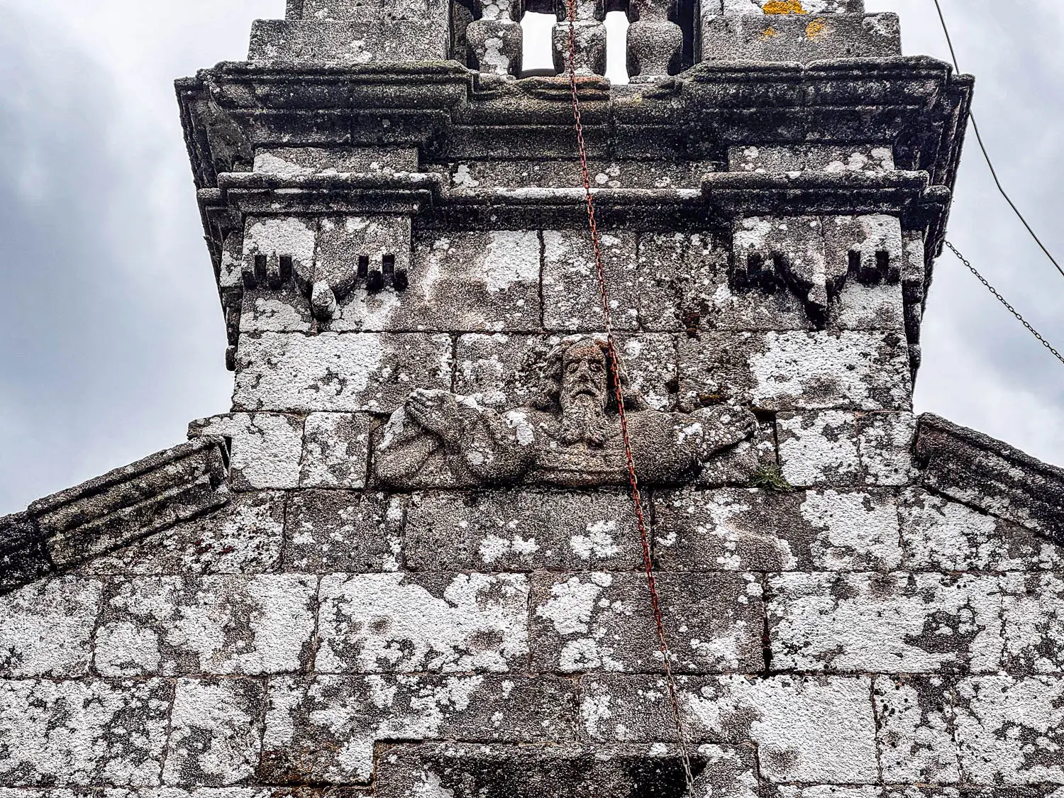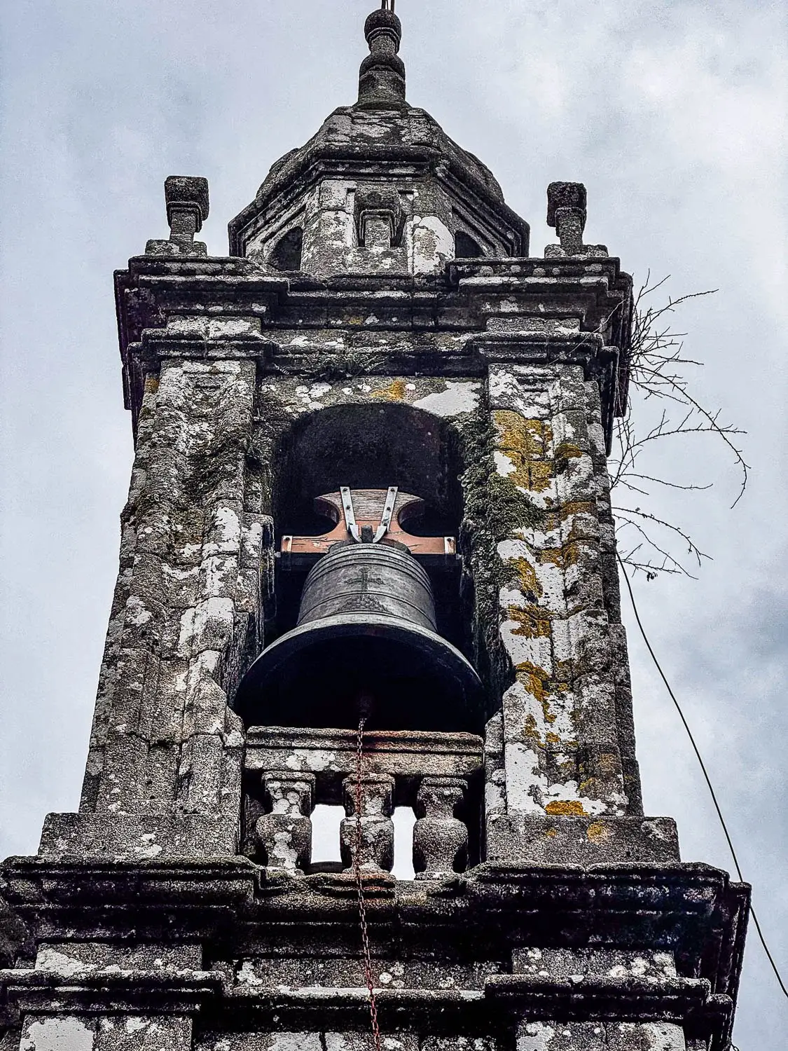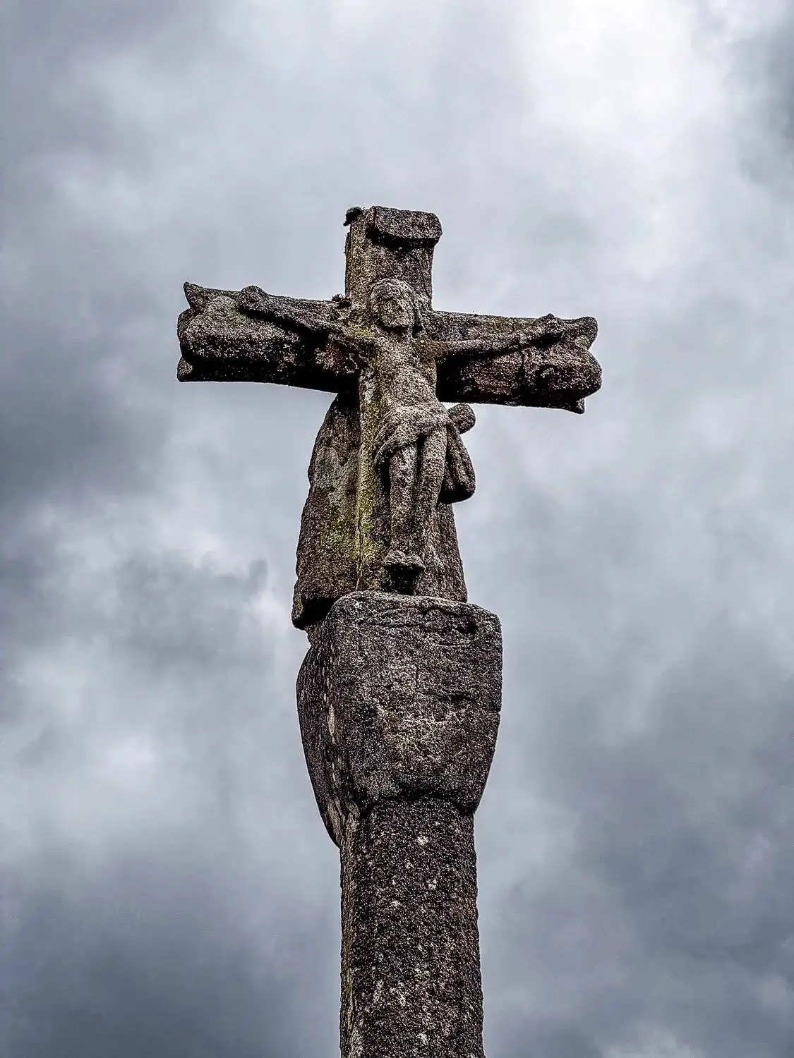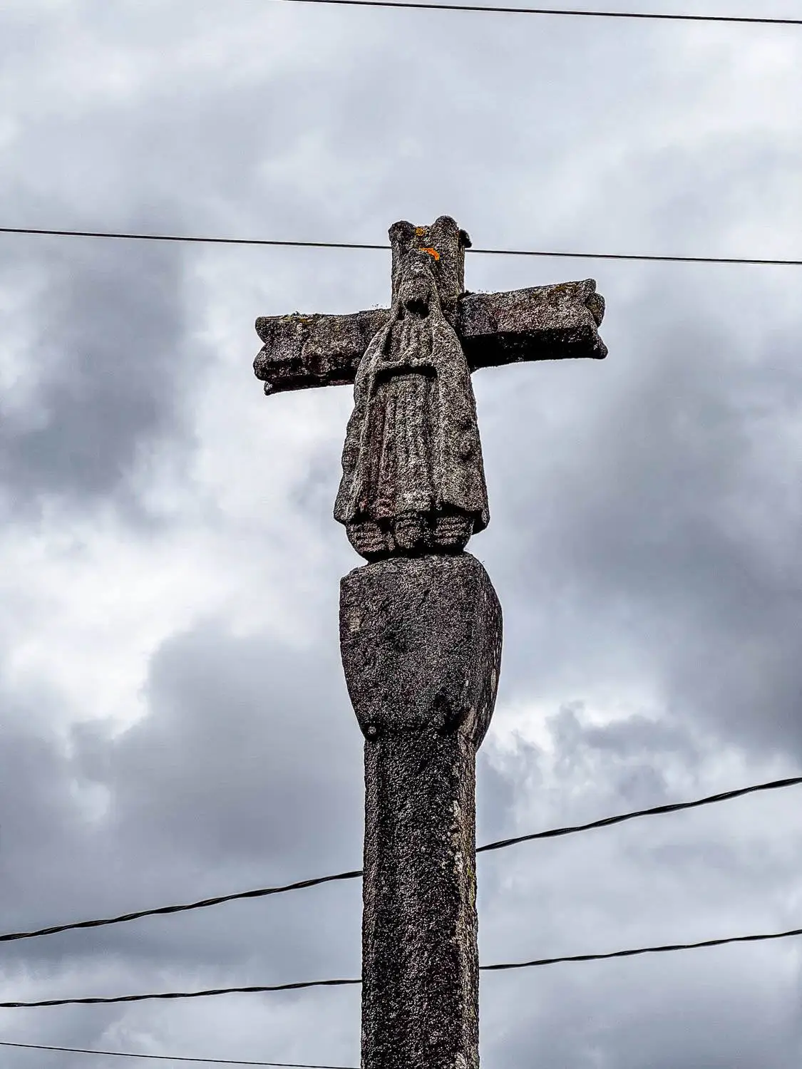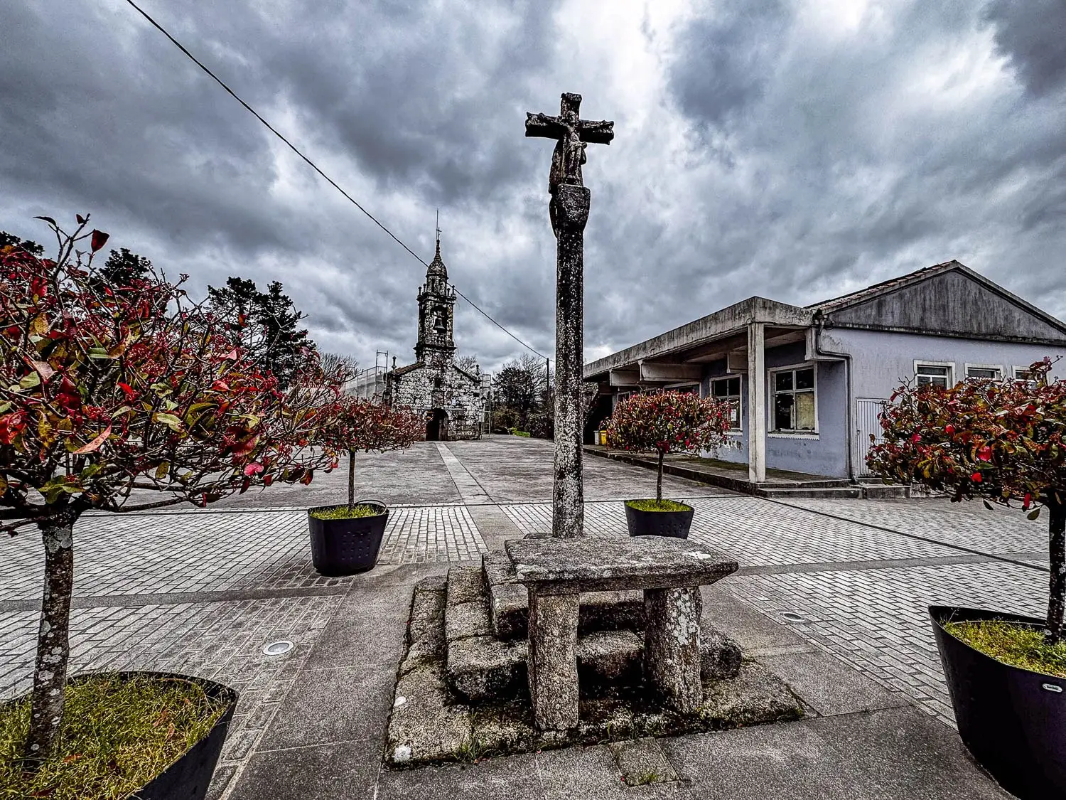 The Church of San Martiño de Olveira, in the municipality of Dumbría, is one of those small temples that discreetly preserve the essence of rural Romanesque architecture in the interior of the Costa da Morte. It is located in a flat environment, marked by crops and a dispersed occupation of the territory, on an open esplanade in which a stone transept located in front of the building also stands out. The temple has a nave with a transept, granite ashlar walls, a gabled roof and an attached sacristy on the north side.