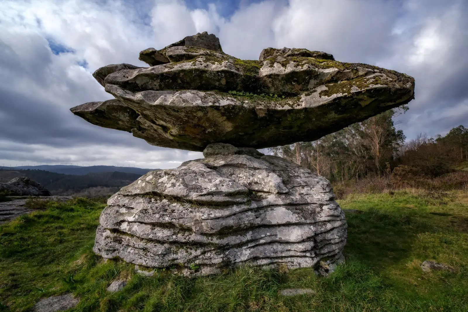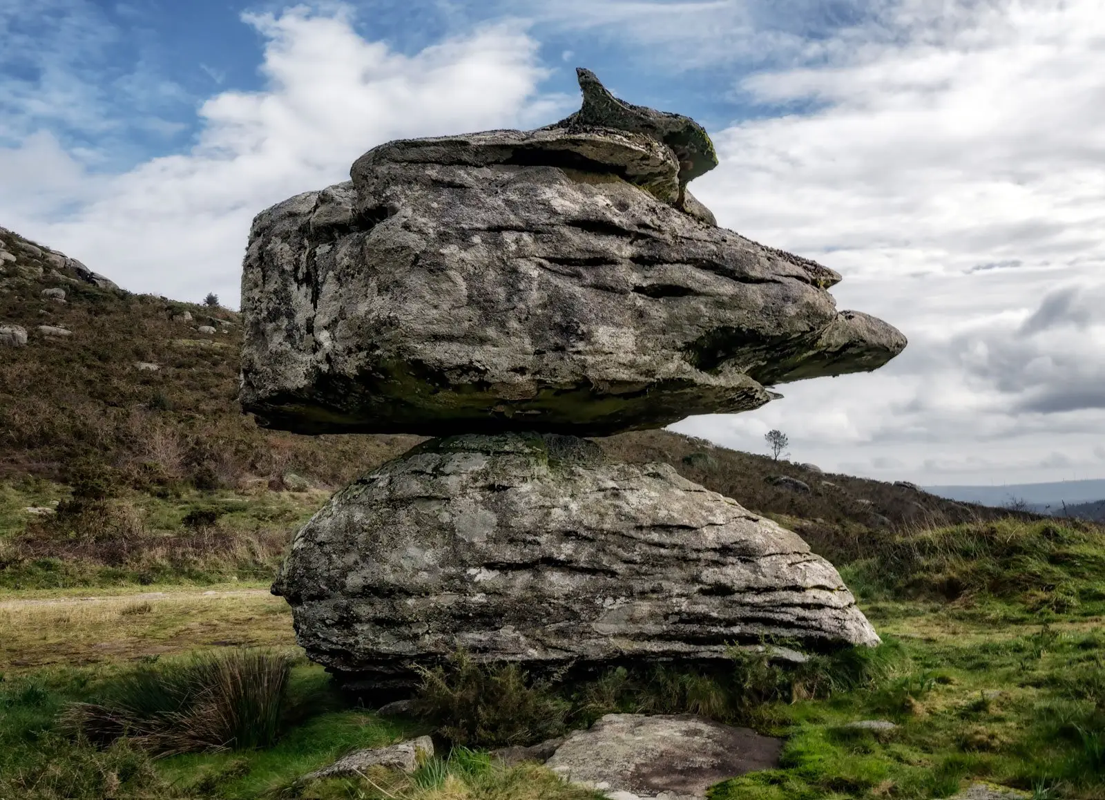 Esta colosal formación granítica está constituída por un enorme penedo dunhas 150 tm, que descansa sobre outro de formas redondeadas, que fai de base, de aí que tamén se denominase Pedra Cabalgada. Chama a atención como a rocha superior é capaz de manter o equilibrio sobre unha base de apoio de dimensións tan reducidas (menos de un metro cadrado de superficie).