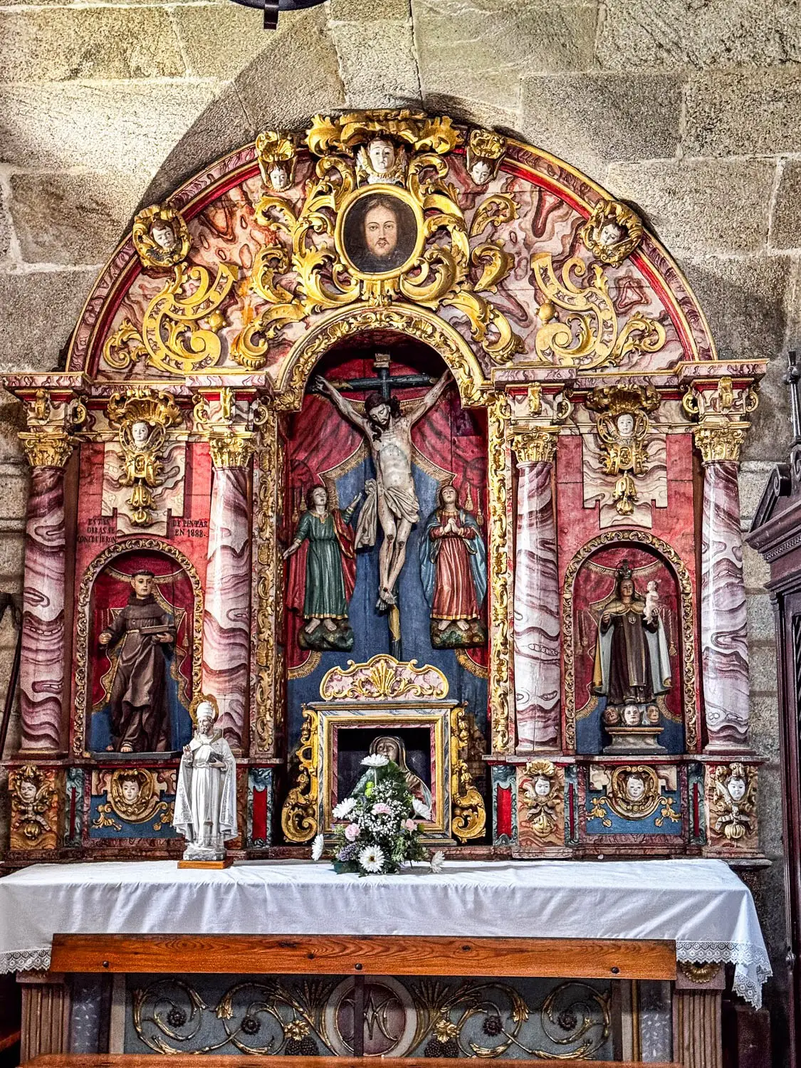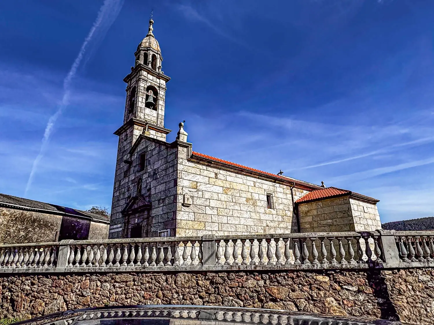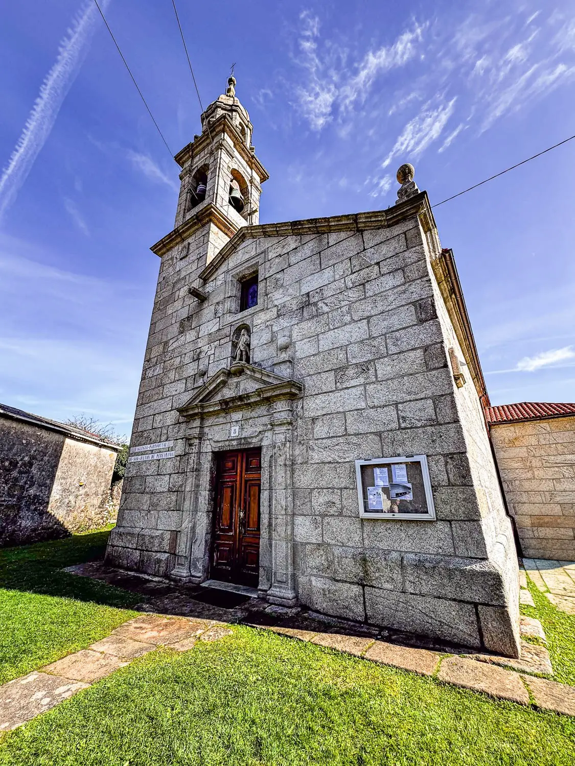 Por fuera, llaman la atención los contrafuertes en la esquina del muro y la fachada con patrón pentagonal, construida con grandes sillares de granito. La portada adintelada, flanqueada por pilastras, deja ver esa influencia compostelana en los recursos compositivos. Remata el conjunto la torre ecléctica del siglo XIX, de dos cuerpos y coronación octogonal, que aporta verticalidad y personalidad a una de las iglesias más singulares del municipio.