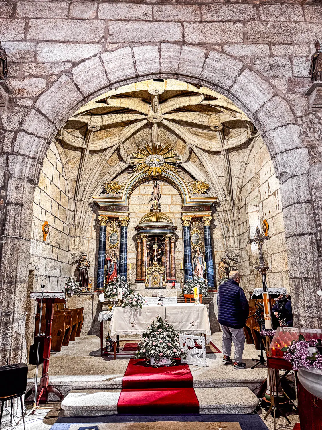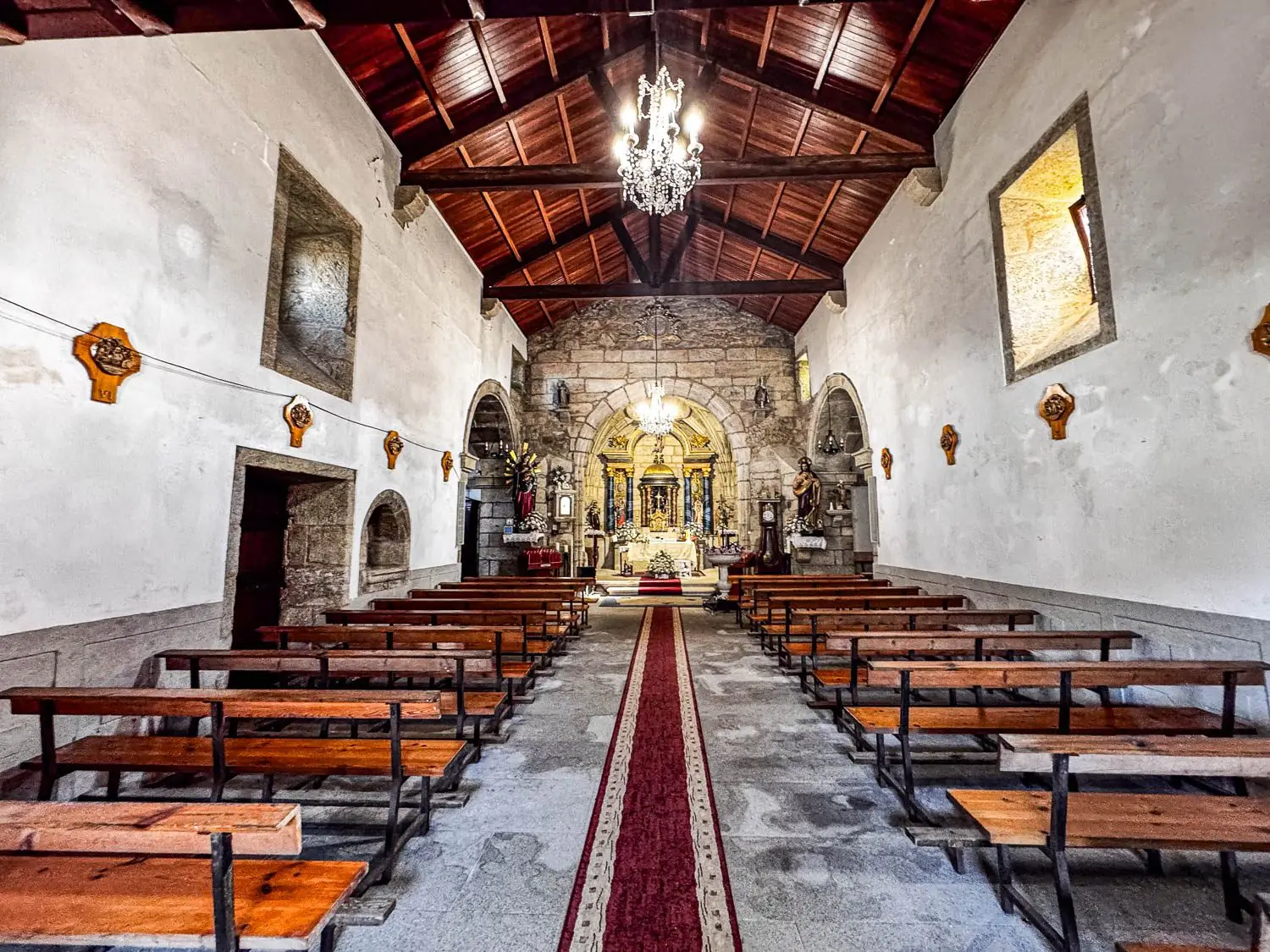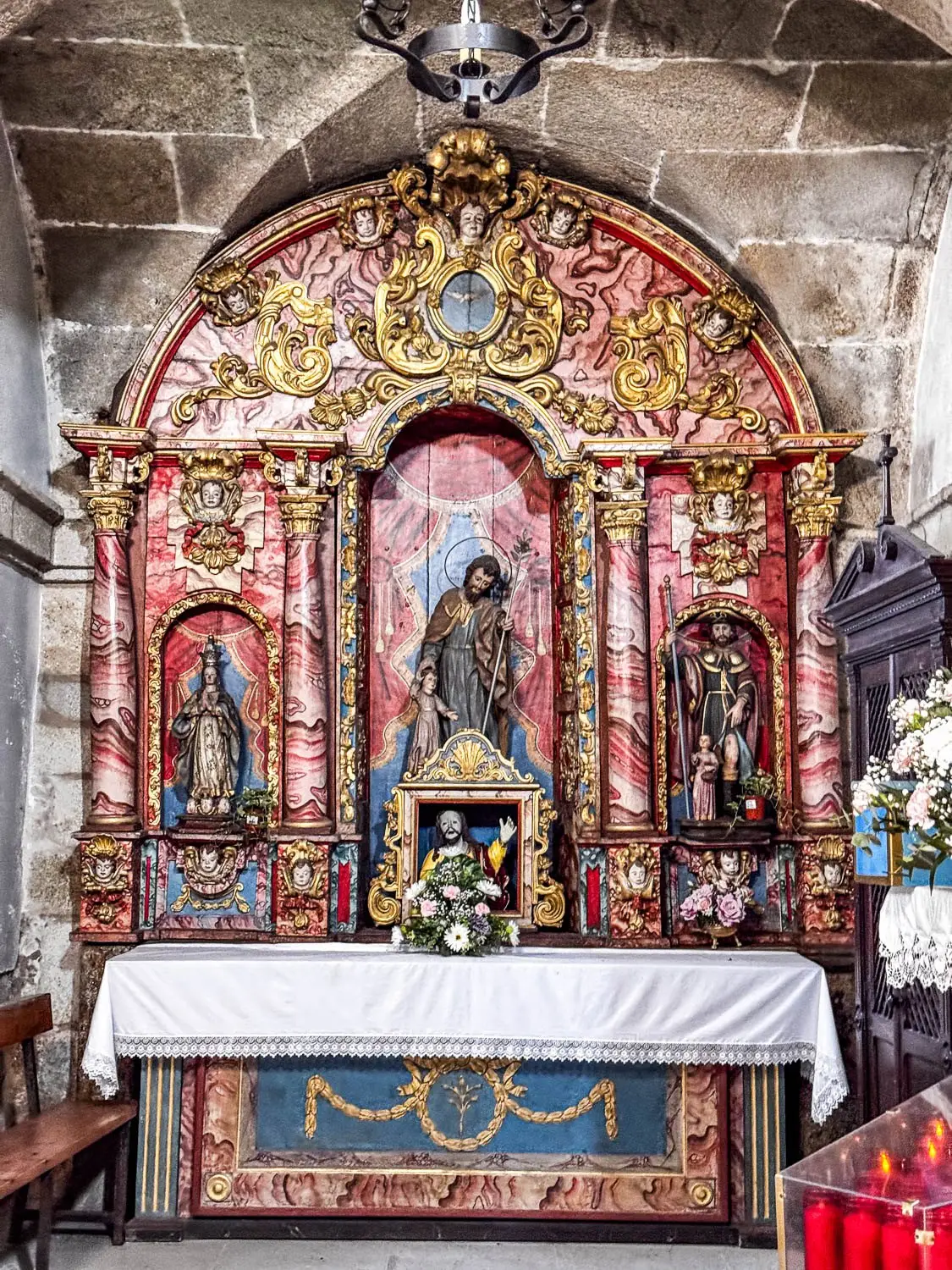 En el interior, la capilla mayor destaca por su bóveda de crucería estrellada, mientras que en los brazos del crucero se abren dos capillas: la del lado sur dedicada al Santo Cristo y la del lado norte a San Antonio. El retablo mayor, de estilo neoclásico, se estructura en tres calles y sitúa en el centro un expositor con la imagen del santo titular; a su alrededor aparecen dos retablos barrocos idénticos, una lectura local de los grandes retablos compostelanos.