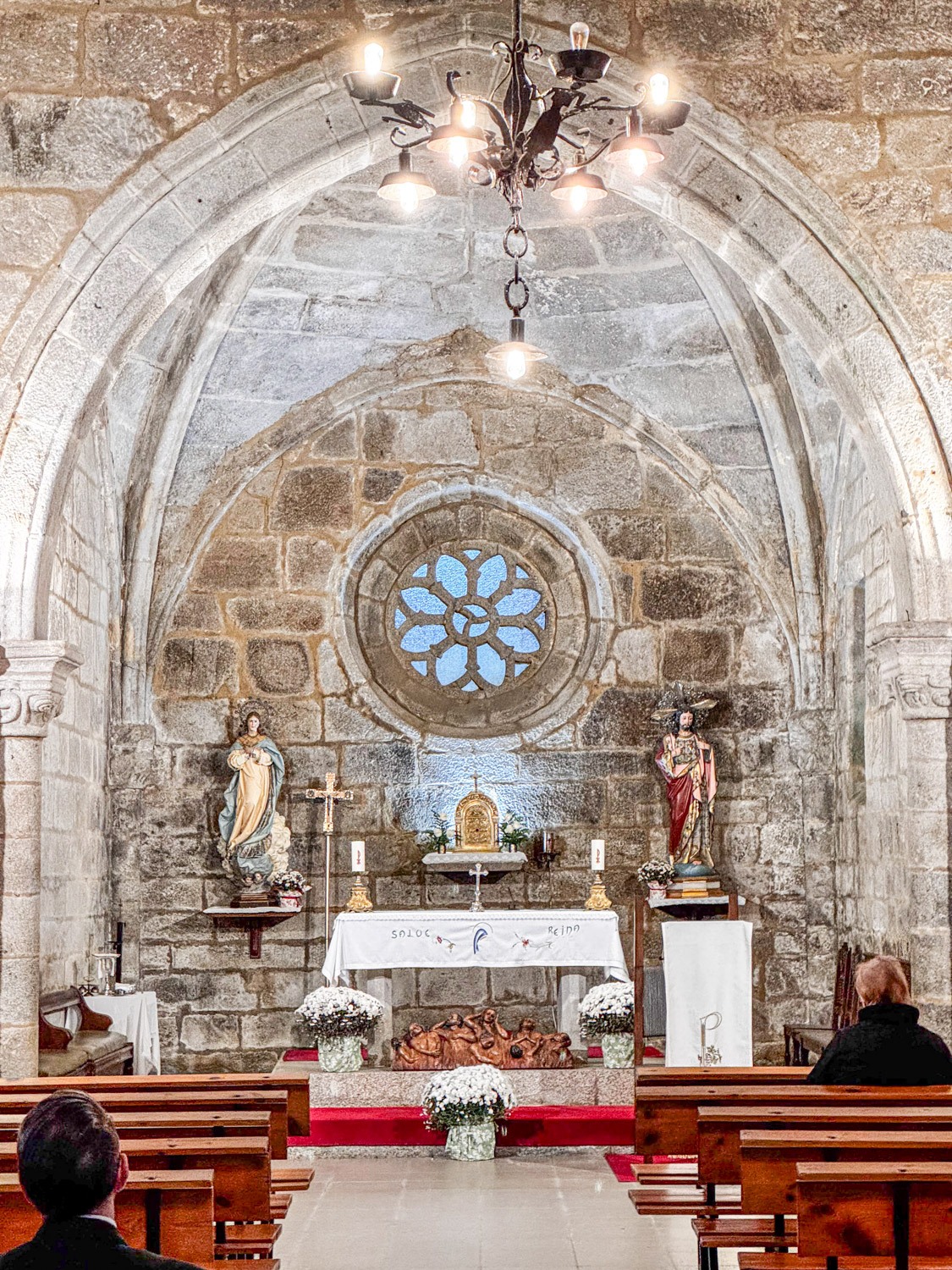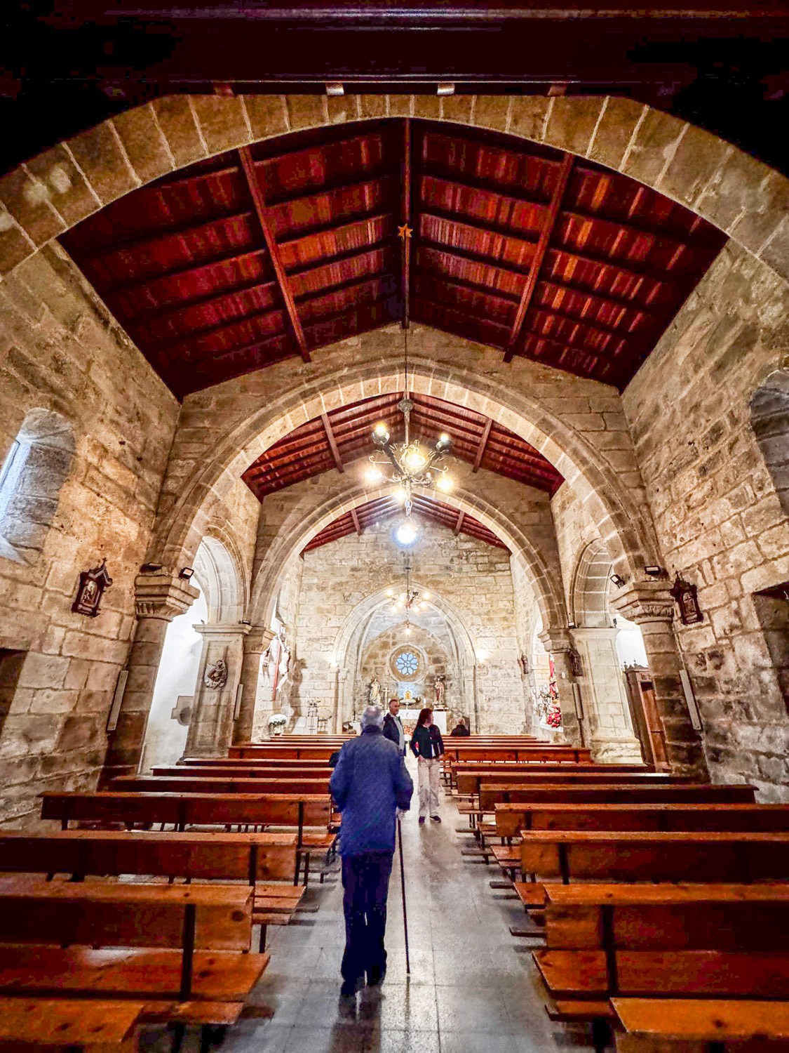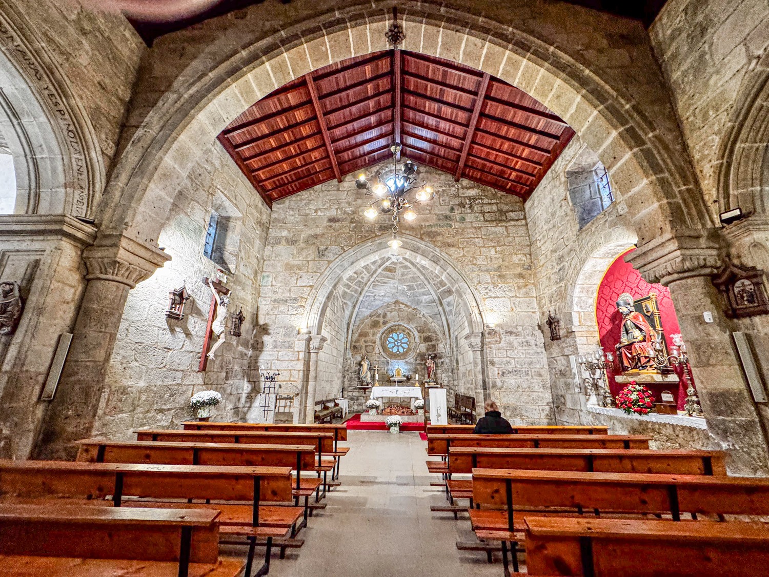 La iglesia se organiza en una planta de salón rectangular, de nave única, y una capilla mayor rectangular. La nave se divide en cuatro tramos mediante tres arcos apuntados con aristas. Los arcos reposan en semicolumnas, rematadas en capiteles decorados con hojas talladas esquemáticamente. La nave lleva una cubierta de madera a dos aguas. La Capilla Mayor se cubre con bóveda cupuliforme (de influjo bizantino) que va sobre nervios diagonales volteados sobre columnas acodilladas.